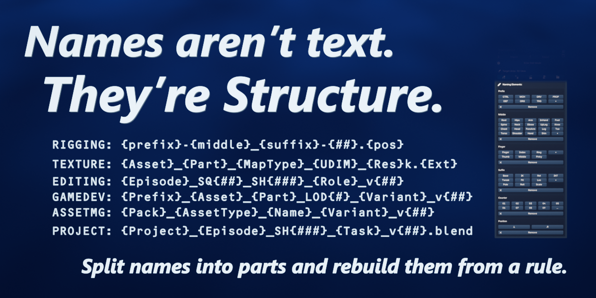Unlike the traditional search‑and‑replace approach, Structured Renamer builds names by rearranging semantically separated name parts. This makes it easier—especially in rigging or other technical 3D projects—to keep your naming conventions consistent.